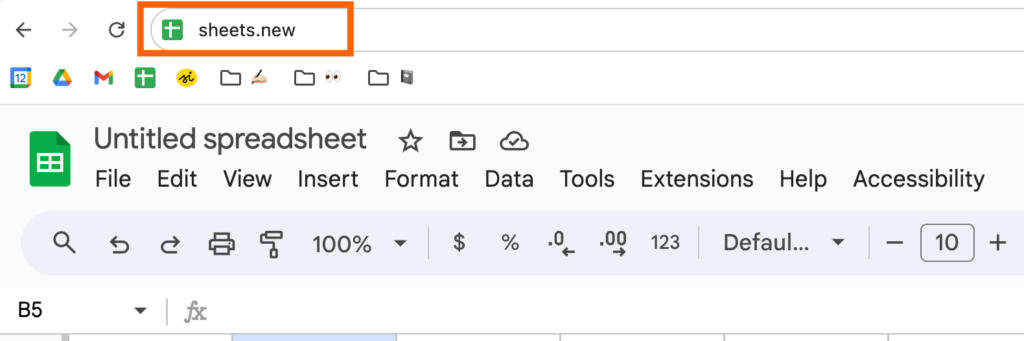 1. Con el navegador abierto, ingrese sheets.new en la barra de direcciones.